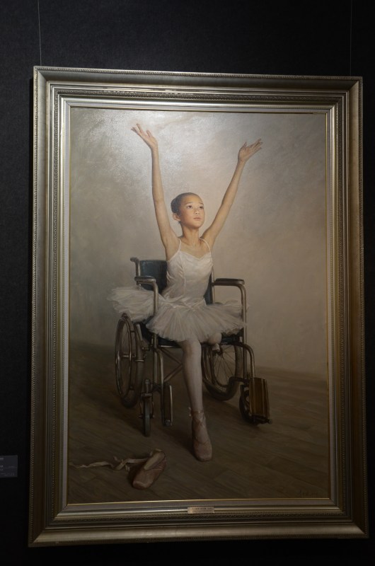 Series of ‘earthquake’ inspired paintings. The artist made paintings of this girl, and after an earthquake this little girl lost her leg…. People cried in front of this.