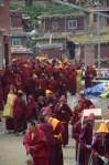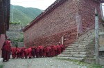 We left our grudges aside and followed some random lamas around to the entrance to a classroom. A few gong rings later, a group of young lamas were all lined up one by one. It was a pretty cute scene, sorta like a bunch of kindergarten kids going to class, except they’re all lamas! A final gong rang, and the lamas lined up neatly, folded their clothes up nicely, made a bow towards the headmaster….. and thinking it was time to go inside, we were wrong! They all scattered quickly and most of them went to take a piss on the side of the road….haha so random.